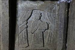 (7)吊丧图砖雕,规格30×30厘米,镶嵌于西壁墓门北侧。画面上雕刻一女子,头披孝巾,身着束腰带宽袖棉袍,站立于一坟墓旁,右袖掩住下巴,左手下垂 ,呈哭泣状。